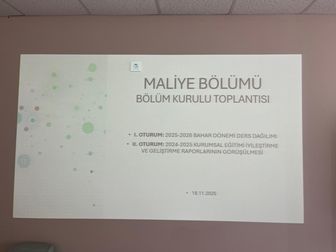 Maliye Bölümü öğretim üyeleri ile öğretim elemanlarının katılımıyla, 2025-2026 Akademik Yılı Bahar Dönemine ilişkin akademik planlamaları görüşmek üzere 18 Kasım 2025 tarihinde saat 11.30’da bir toplantı gerçekleştirilmiştir. Toplantıda bahar dönemine yönelik iyileştirme alanları değerlendirilmiş ve eğitim-öğretim faaliyetlerinin daha etkin yürütülmesine ilişkin planlamalar yapılmıştır. Gündem maddelerinin görüşülmesinin ardından toplantı sona ermiştir.