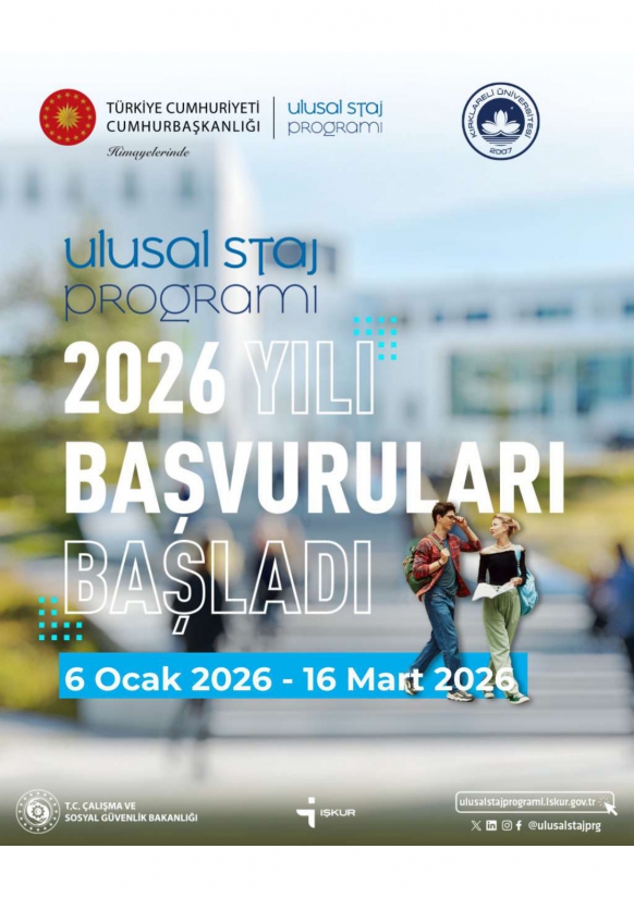 Değerli öğrencilerimiz, Cumhurbaşkanlığı himayelerinde İŞKUR tarafından koordine edilen, kamu kurumları ve gönüllü özel sektör kuruluşlarında stajyapma imkânı bulacağınız Ulusal Staj Programı’nın 2026 yılı başvuruları başladı. Son başvuru tarihi 16 Mart 2026’dır. Başvurularınızı https://ulusalstajprogrami.iskur.gov.tr/ adresinden yapabilirsiniz.