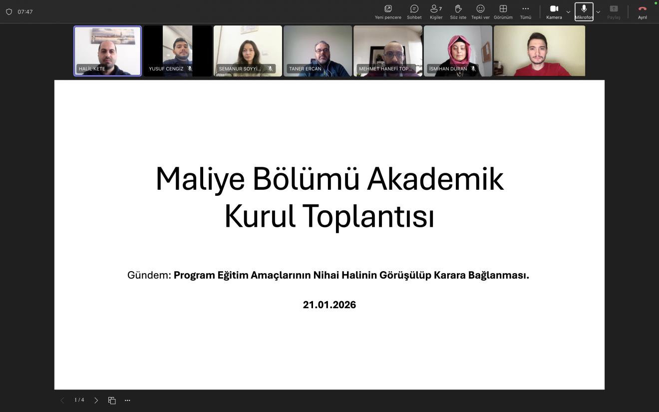 21.01.2026 tarihinde saat 13.00’te çevrimiçi ortamda, Program Eğitim Amaçları Ölçme ve Değerlendirme Komisyonutarafından belirlenen ve müteakiben Sürekli İyileştirme Komisyonu tarafından revize edilen program eğitim amaçlarının görüşülmesi gündemiyle Bölüm Akademik Kurul Toplantısı gerçekleştirilmiştir.